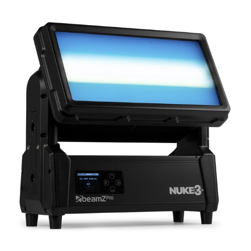 The Nuke3 Motorized Strobe/Wash is a powerful, versatile lighting fixture with a 180° motorized tilt for dynamic movement. Combining 96 cool white LEDs with 864 RGB LEDs, it delivers intense strobes, vibrant washes, or both simultaneously. With pixel mapping, DMX control, built-in programs, and an electronic frost filter, it’s easy to create striking visual effects. Rated IP65, the Nuke3 performs flawlessly indoors or outdoors.