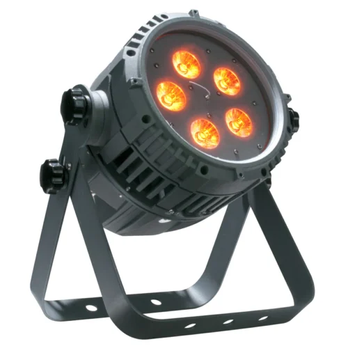 – IP65, Outdoor Rated, flat par fixture with five Quad RGBA LEDs (4-in-1 Red, Green, Blue & Amber LEDs)